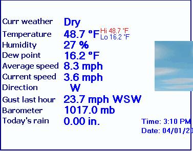 | Humidity | 27 %, Humidex 41.9°F | Barometer corrected to msl | 1017.0 mb |